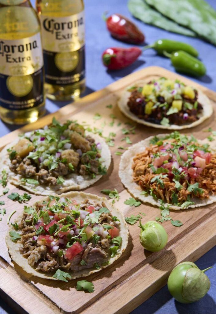 ホロホロに煮込んだ豚肉「カルニータス」や、スパイス香る鶏肉「ティンガ・デ・ポジョ」、そして注文ごとに仕上げるサクサクの「揚げたてタコス」など、多彩な具材を自由に乗せて楽しむことができます。